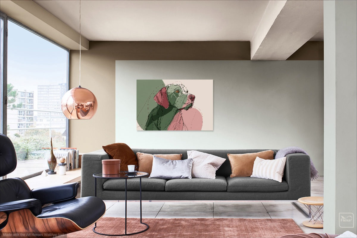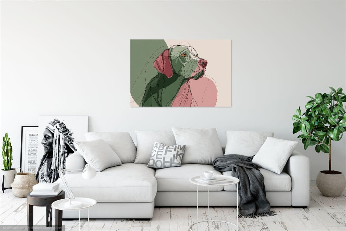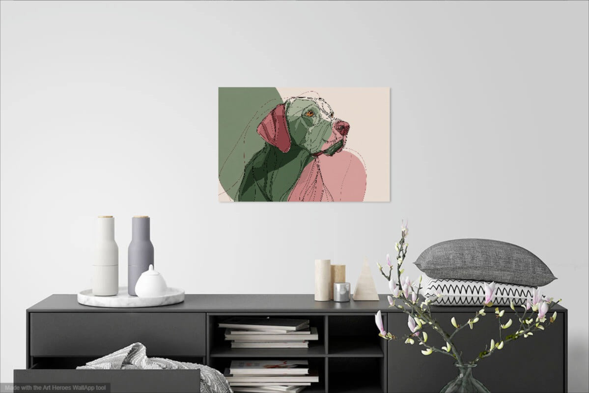 Ten wyjątkowy obraz przedstawia Labradora w nowoczesnej, abstrakcyjnej formie, łącząc delikatną linię z wyraźnymi płaszczyznami koloru. Styl obrazu oparty jest na sztuce liniowej i lekkim kubizmie, gdzie dynamiczne kontury przeplatają się z warstwami głębokiej zieleni i zgaszonego różu. Kompozycja łączy ekspresję z harmonią, przyciągając uwagę i nadając przestrzeni artystycznego wyrazu. To propozycja dla osób, które poszukują nieoczywistej, ale estetycznej dekoracji z duszą.