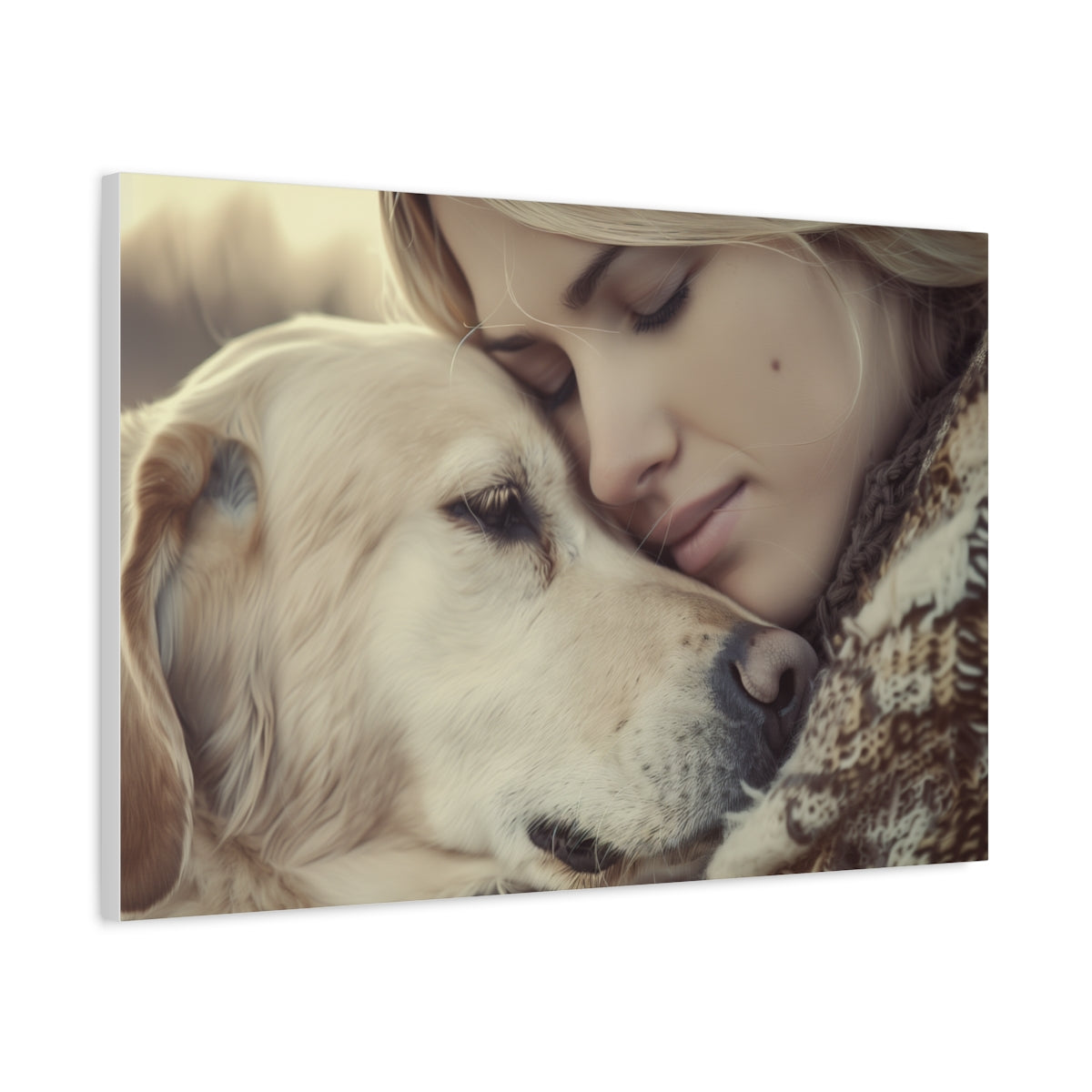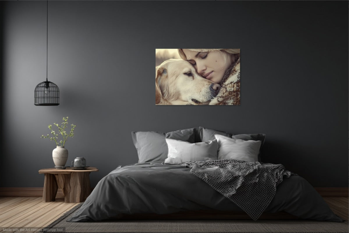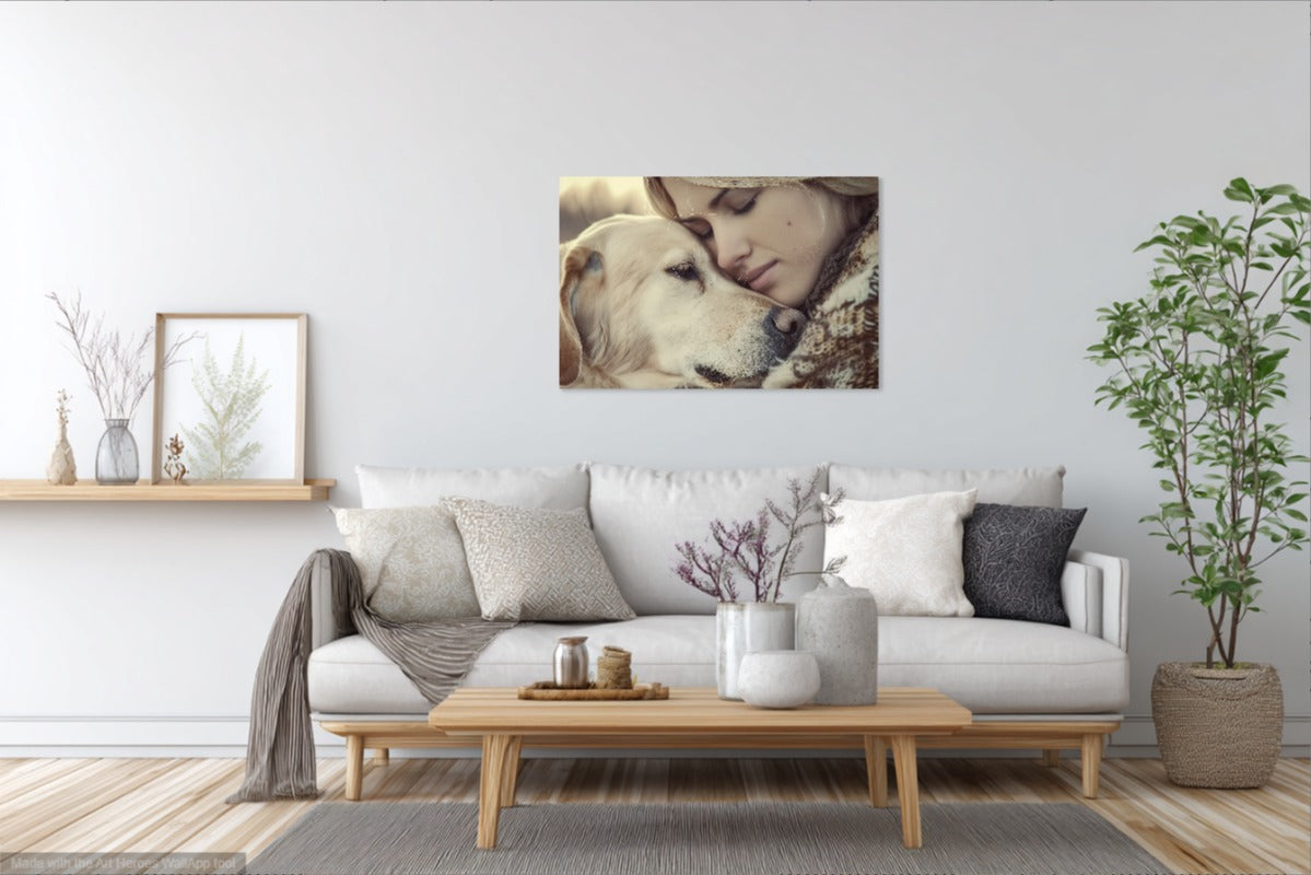 Ten poruszający obraz w stylu fotorealistycznym ukazuje intymny moment bliskości między kobietą a jej Labradorem. Subtelne światło, pastelowa paleta barw i miękkie przejścia tonalne budują atmosferę spokoju i czułości. Kremowe i beżowe odcienie doskonale współgrają z naturalną fakturą swetra oraz sierści psa, tworząc harmonijną, emocjonalną kompozycję. To dzieło emanuje miłością, bezpieczeństwem i głębokim zaufaniem – uczuciami, które są uniwersalne i ponadczasowe.
