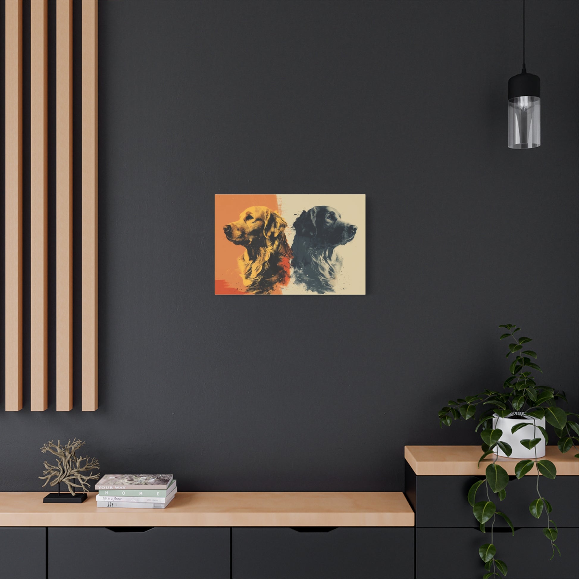 Ten unikalny obraz przedstawia dwa oblicza Golden Retrievera – psa, który symbolizuje lojalność, łagodność i inteligencję. Kompozycja łączy ciepłe, pomarańczowo-żółte barwy z jednej strony oraz chłodną, monochromatyczną tonację z drugiej, tworząc efekt dualizmu: światła i cienia, energii i spokoju, dnia i nocy.