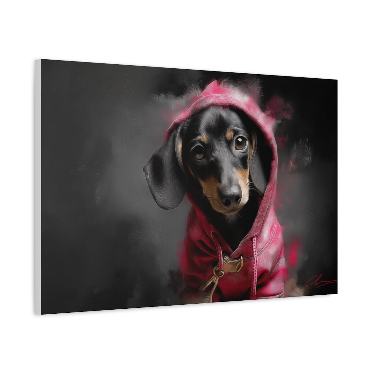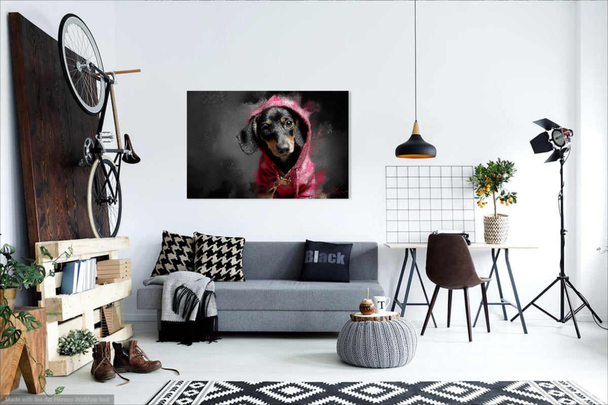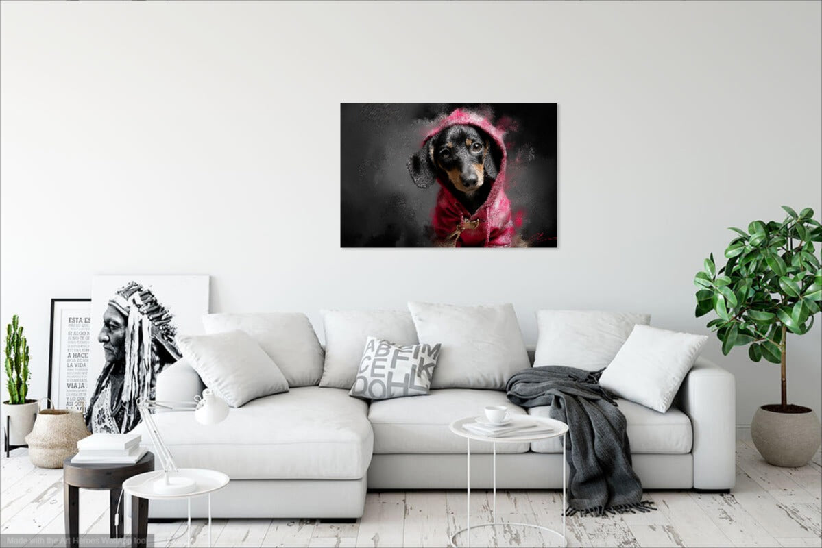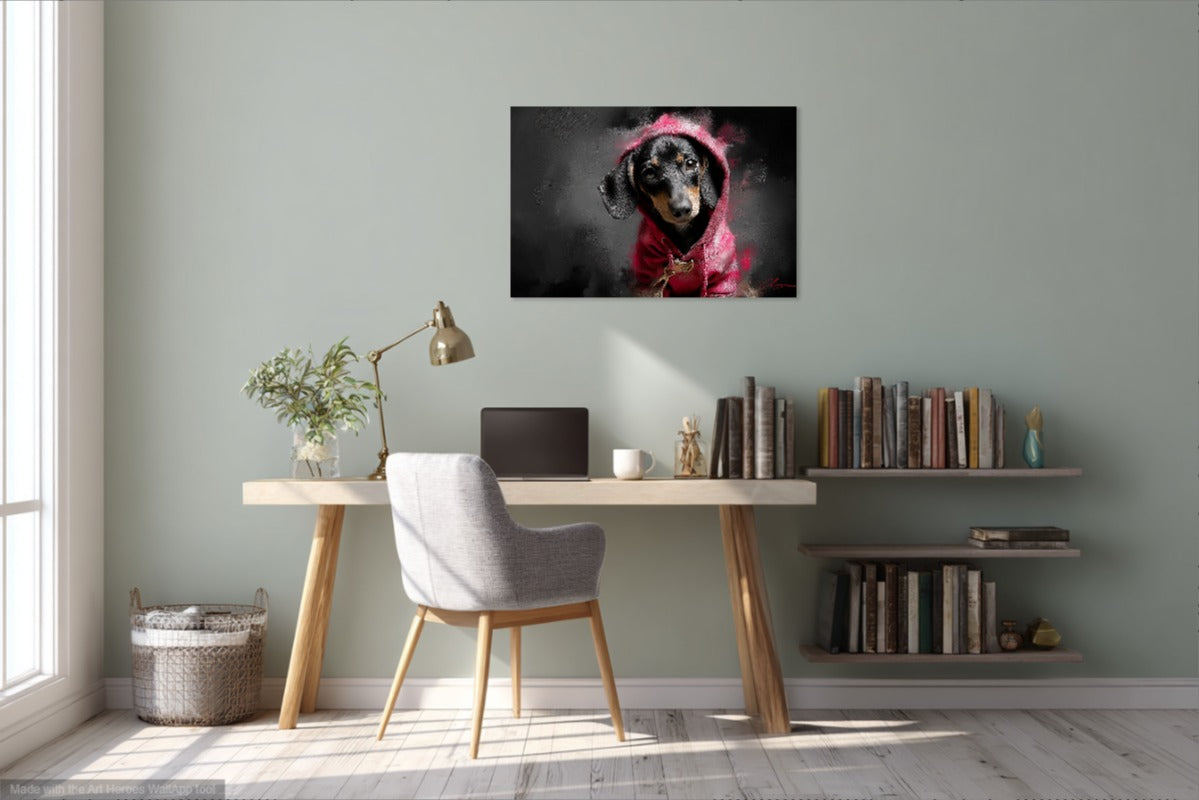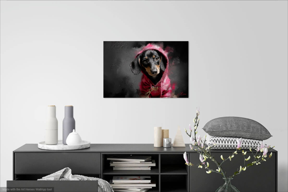 Ten wyrazisty obraz przedstawia jamnika ubranego w różową bluzę z kapturem, utrzymany w stylu street artu inspirowanego Banksym. Ciemne, dymne tło w odcieniach czerni i szarości kontrastuje z nasyconą czerwienią ubrania, przyciągając wzrok i nadając całości nowoczesny, miejski klimat. Tekstura obrazu przypomina pociągnięcia pędzla i sprayu, nadając mu artystyczną głębię i charakterystyczny, surowy styl. Wyraz oczu jamnika – pełen emocji i niewinności – tworzy silny kontrapunkt wobec ulicznej estetyki tła.