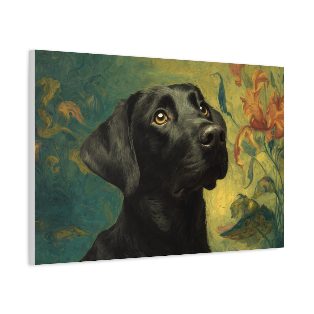 Czarny Labrador Na Tle Artystycznego Ogrodu – Obraz Malarski