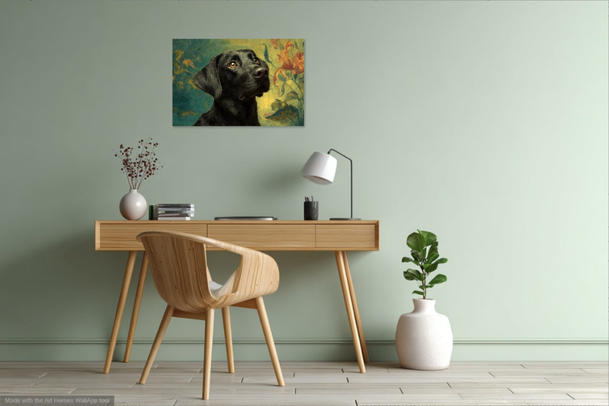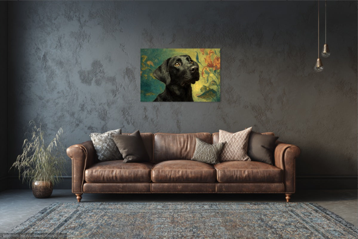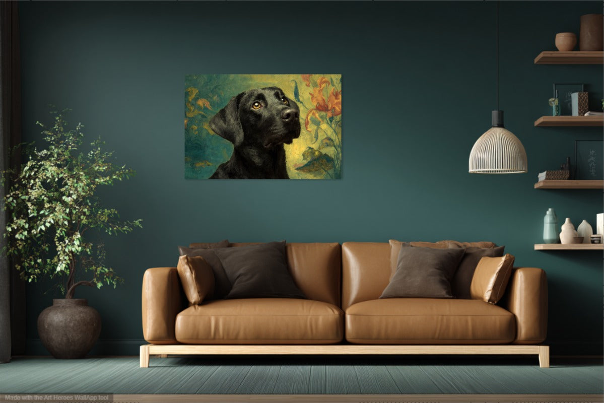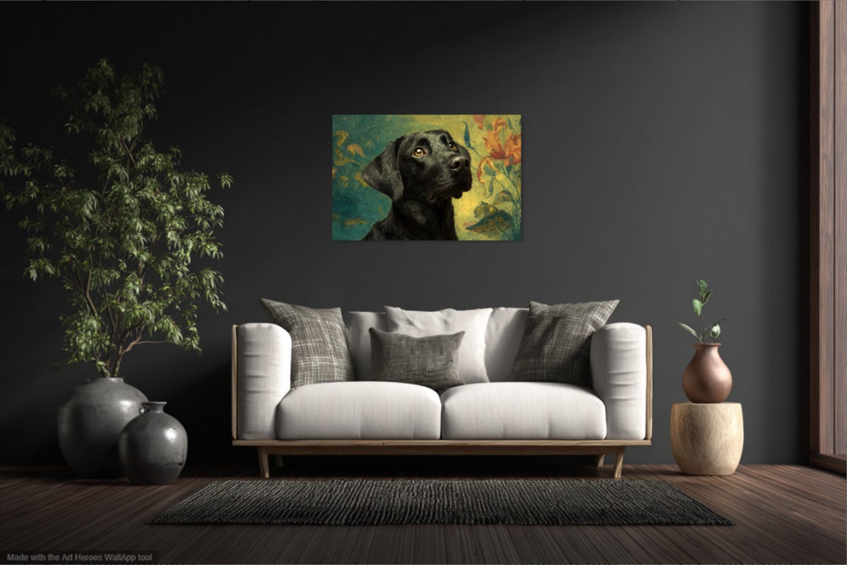 Ten artystyczny obraz przedstawia czarnego labradora na tle ekspresyjnego, malarskiego tła inspirowanego estetyką surrealizmu i stylu impresjonistycznego. Uwagę przykuwa głęboki, pełen emocji wzrok psa oraz bogactwo faktur i detali w jego sierści. Kolorystyka obrazu to zmysłowe połączenie ciemnych zieleni, głębokich turkusów oraz złotych i pomarańczowych tonów, które podkreślają kontrast między spokojem spojrzenia psa a dynamicznym tłem pełnym florystycznych kształtów i miękkich przejść kolorów. Obraz zachwyca swoją ekspresją i tajemniczym klimatem.