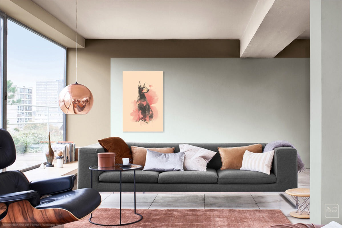 Obraz przedstawia dumnego Dobermana w nowoczesnym, artystycznym stylu łączącym precyzyjny lineart z delikatnymi plamami akwareli w odcieniach różu i czerni. Tło w tonacji bardzo jasnego beżu (niemal ecru) sprawia, że całość zyskuje lekkość i elegancję. Mimo wyrazistego charakteru rasy, obraz emanuje spokojem i harmonią dzięki pastelowej kolorystyce i miękkim przejściom tonalnym.