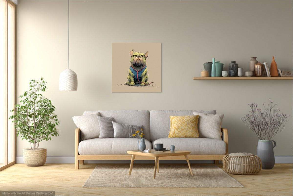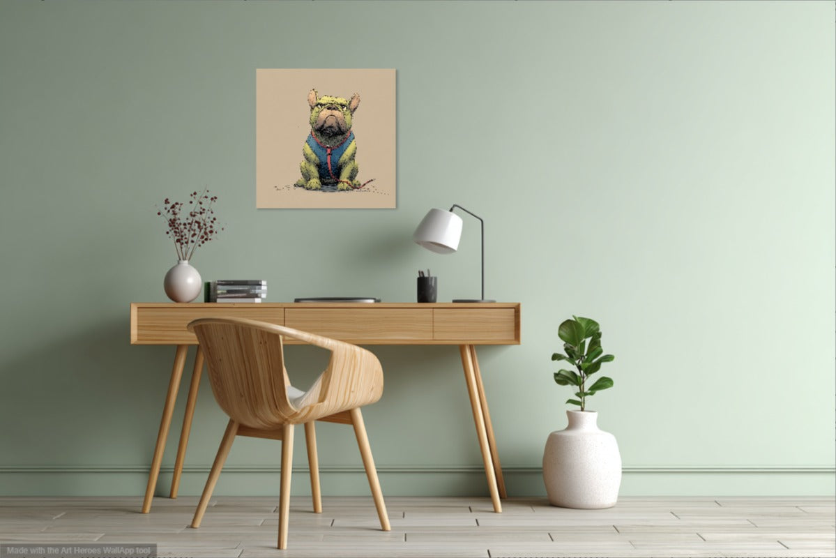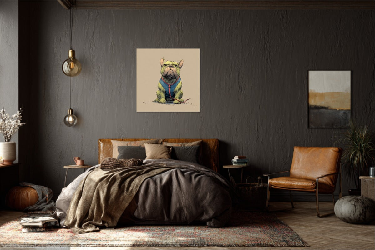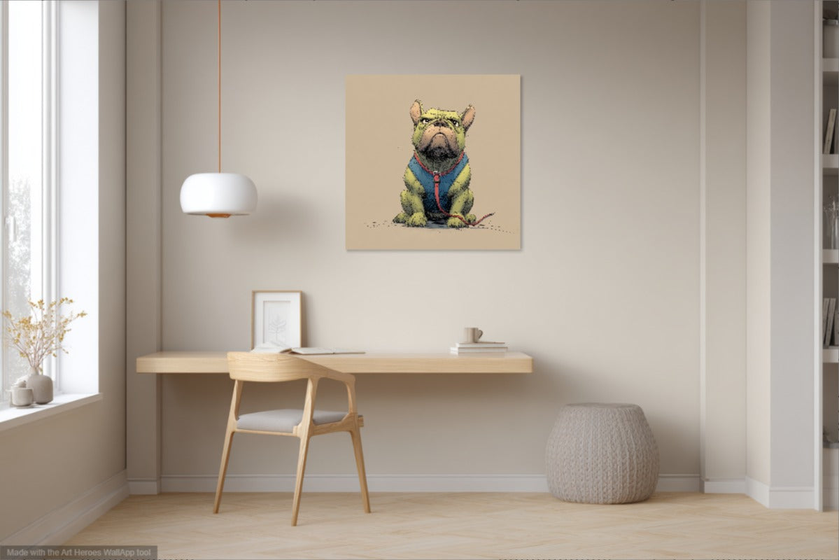 Ten obraz przedstawia francuskiego buldoga w komiksowym, lekko przerysowanym stylu, który z pewnością przyciąga uwagę. Pies o mocno zbudowanej sylwetce i intensywnie zielonym umaszczeniu – przypominającym nieco Hulka – nosi niebieską kamizelkę i czerwoną smycz, co dodaje mu charakteru i humorystycznego uroku. Ilustracja została wykonana z dużą dbałością o detal, z wyraźną kreską i stonowanym, beżowym tłem, które pozwala postaci psa grać pierwsze skrzypce. Obraz emanuje zabawnym, nieco zadziornym nastrojem i doskonale łączy w sobie elementy kreskówki z artystyczną estetyką.