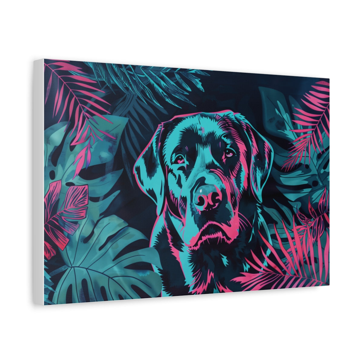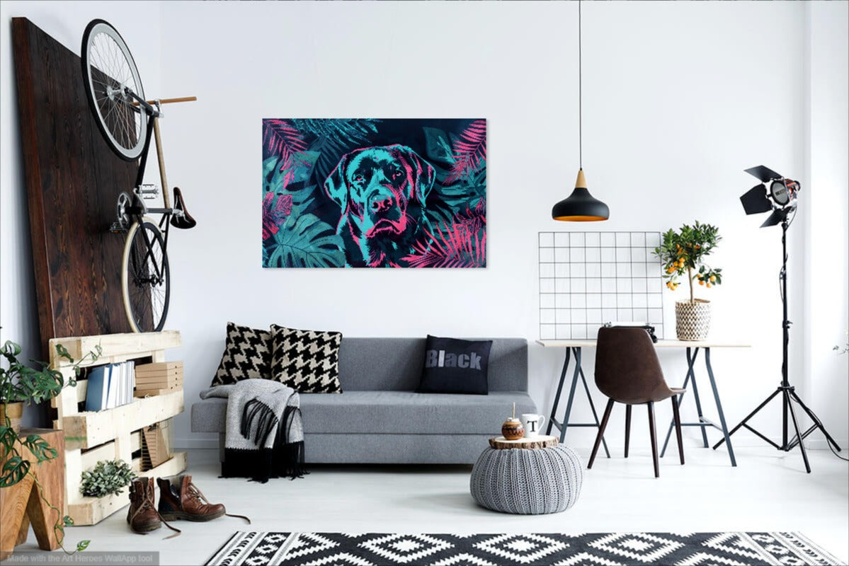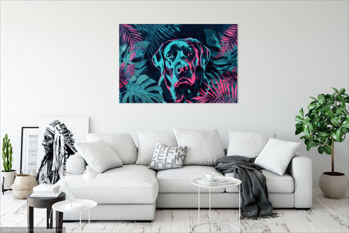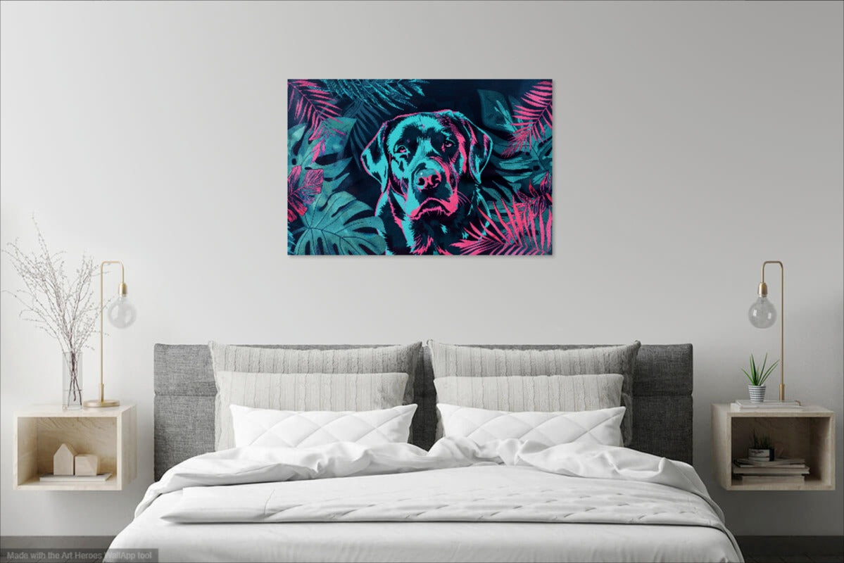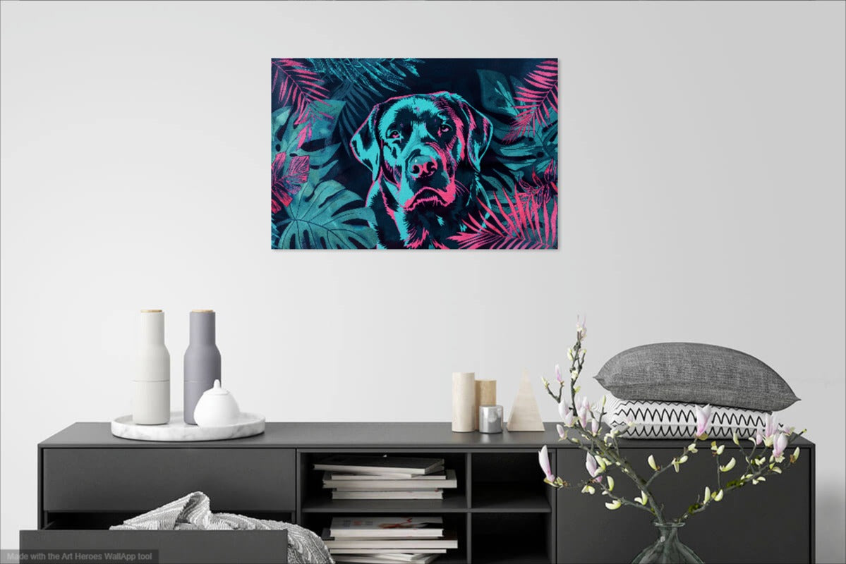 Ten obraz przedstawia Labradora w unikalnym, nowoczesnym stylu inspirowanym neonowym pop-artem. Intensywne kontrasty turkusu i różu zestawione z ciemnym tłem tworzą dynamiczną, energetyczną kompozycję. Tropikalne liście otaczające psa nadają całości egzotycznego charakteru, wprowadzając świeżość i odważny, artystyczny klimat.