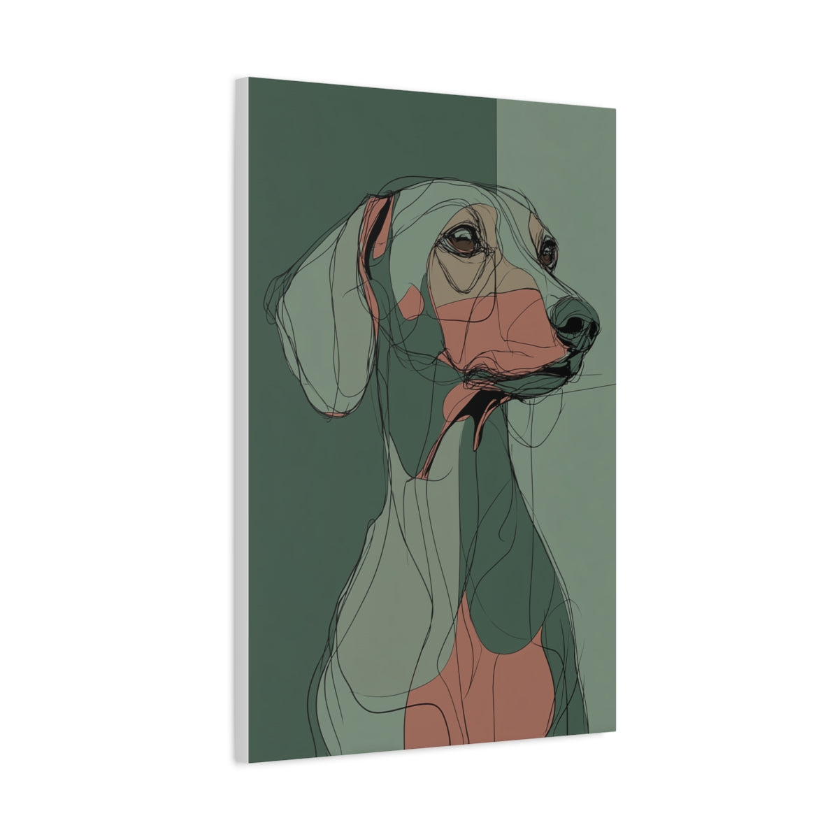 Ten obraz to nowoczesna, abstrakcyjna interpretacja jamnika, wykonana w stylu line art z geometrycznymi wypełnieniami. Swobodna, szkicowa linia kontrastuje z płaskimi plamami koloru, tworząc efekt z pogranicza rysunku i grafiki cyfrowej. Dominują przygaszone odcienie zieleni, szałwii i pudrowego różu, co nadaje pracy elegancki, wyciszony charakter. Kompozycja jest dynamiczna, ale jednocześnie minimalistyczna, co sprawia, że obraz intryguje i przyciąga uwagę swoją nietuzinkową formą.