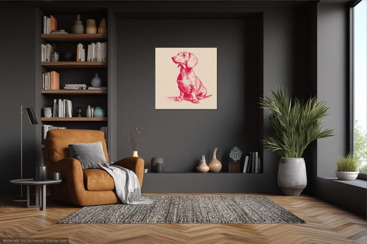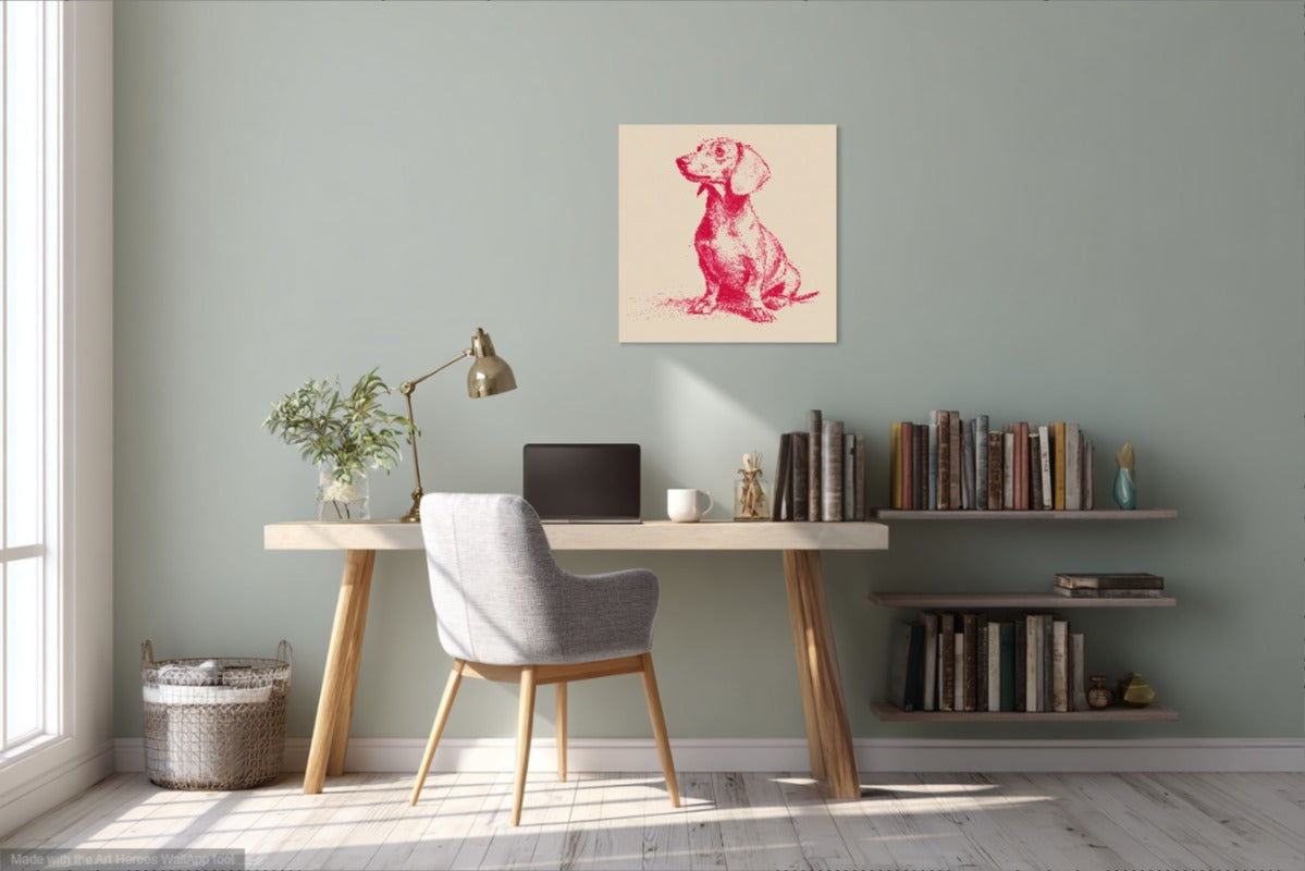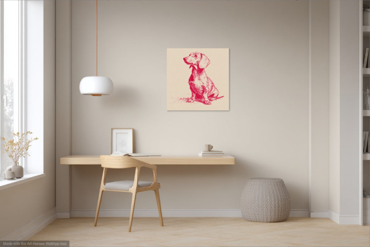 Ten obraz przedstawia uroczego jamnika narysowanego w stylu minimalistycznym, przypominającym szkicownikowy rysunek (sketchnote). Całość wykonana jest wyłącznie jedną linią kolorystyczną – intensywnym odcieniem malinowej czerwieni – na kremowym tle. Taki kontrast nadaje ilustracji wyjątkowej elegancji i prostoty, a ręcznie szkicowana kreska wprowadza autentyczność i artystyczny charakter. Obraz emanuje spokojem i subtelną ekspresją, idealnie oddając osobowość tego sympatycznego psa.