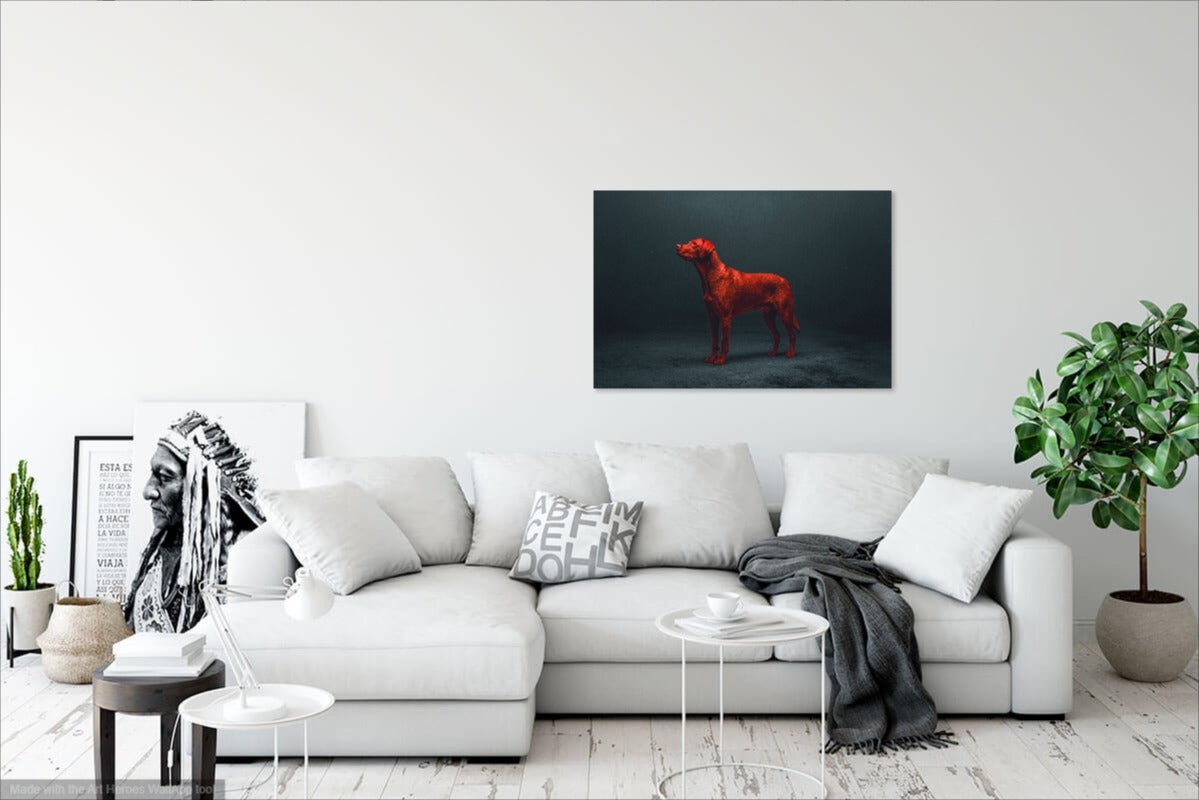 Ten wyjątkowy obraz ukazuje surrealistycznie przedstawionego Labradora w intensywnie czerwonym kolorze, stojącego na matowym, ciemnoszarym tle. Minimalistyczna kompozycja i mocny kontrast kolorystyczny nadają dziełu niezwykłej głębi i ekspresji, idealnie wpisując się w estetykę nowoczesnej sztuki cyfrowej. Styl obrazu łączy elementy realizmu z nutą fantastyki, co sprawia, że przyciąga wzrok i wzbudza emocje – doskonały wybór dla osób ceniących odważne akcenty wizualne.