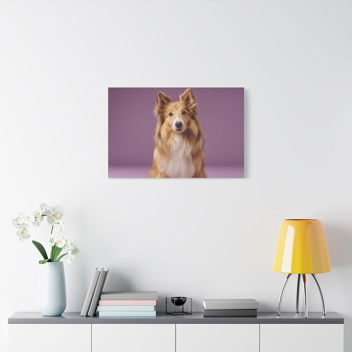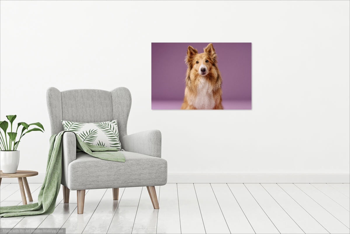 Ten obraz ukazuje majestatycznego Owczarka szetlandzkiego w niezwykle eleganckim, studyjnym ujęciu na tle gładkiej, fioletowo-liliowej ściany. Ciepła paleta kolorystyczna sierści psa – złocisty brąz, kremowa biel i subtelne ciemniejsze akcenty – doskonale kontrastuje z chłodnym, pastelowym tłem, tworząc efekt harmonii i wizualnej równowagi. Styl fotografii jest nowoczesny i minimalistyczny, z naciskiem na detale i ekspresję – to portret pełen spokoju, gracji i psiej mądrości.