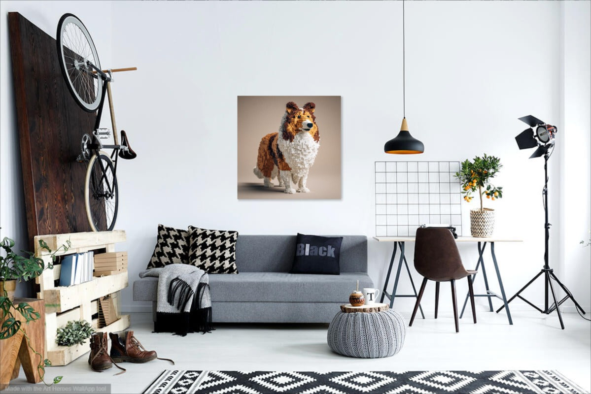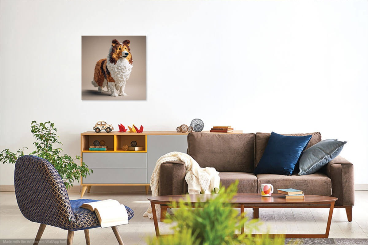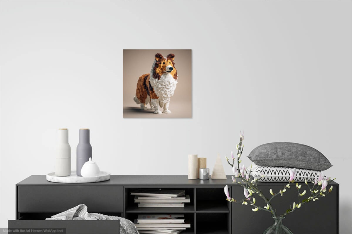 Ten oryginalny obraz przedstawia owczarka szetlandzkiego zbudowanego z klocków LEGO, uchwyconego w eleganckim, minimalistycznym stylu. Konstrukcja psa wykonana jest z drobnych, geometrycznych bloków, co nadaje całości efekt pixel artu w trójwymiarze. Kolorystyka obrazu opiera się na naturalnych, ciepłych tonach brązu, bieli i rudego, co kontrastuje z neutralnym tłem w odcieniu beżu, nadając pracy nowoczesny i wyważony charakter.