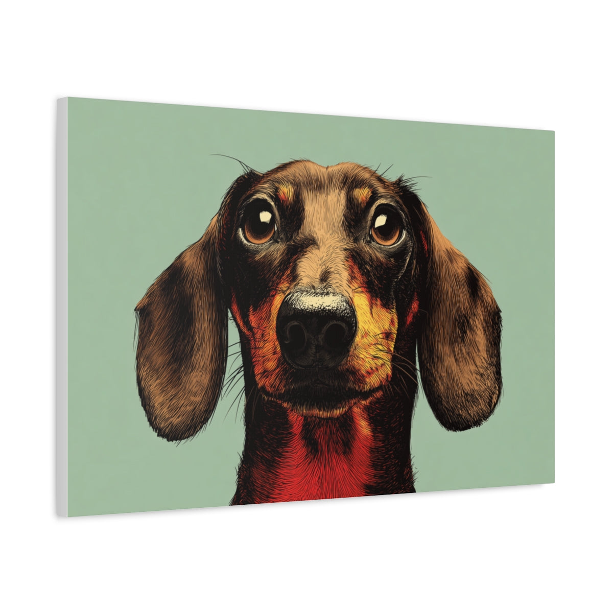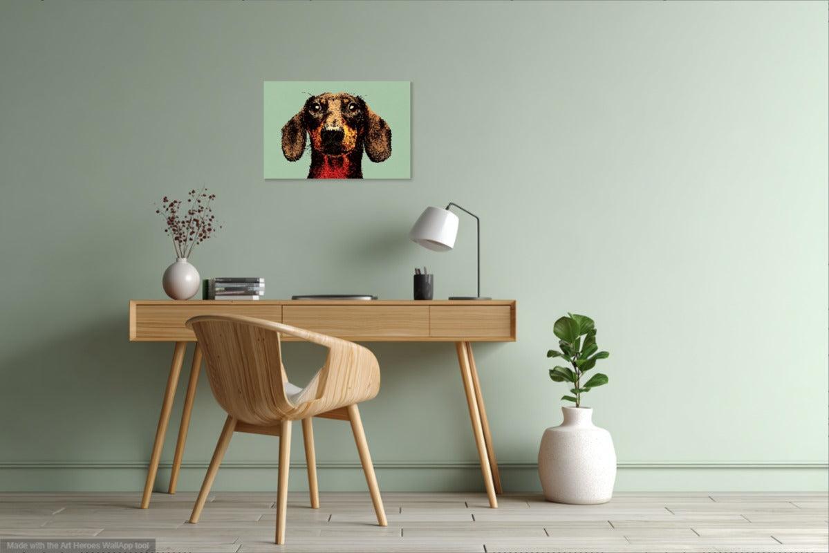 Ten nowoczesny portret jamnika wykonany w stylu graficznym zachwyca swoją precyzją i charakterem. Głębokie, wyraziste kreski imitujące technikę rysunku tuszem podkreślają teksturę sierści, a ciepła paleta barw – rudości, brązy i beże – nadaje postaci psa naturalności i emocjonalnej głębi. Kontrastujące tło w odcieniu jasnej mięty tworzy idealne, spokojne tło, które dodatkowo eksponuje intensywność spojrzenia i detali. Obraz ten łączy klasykę ilustracji z nowoczesnym podejściem do portretu zwierzęcego.