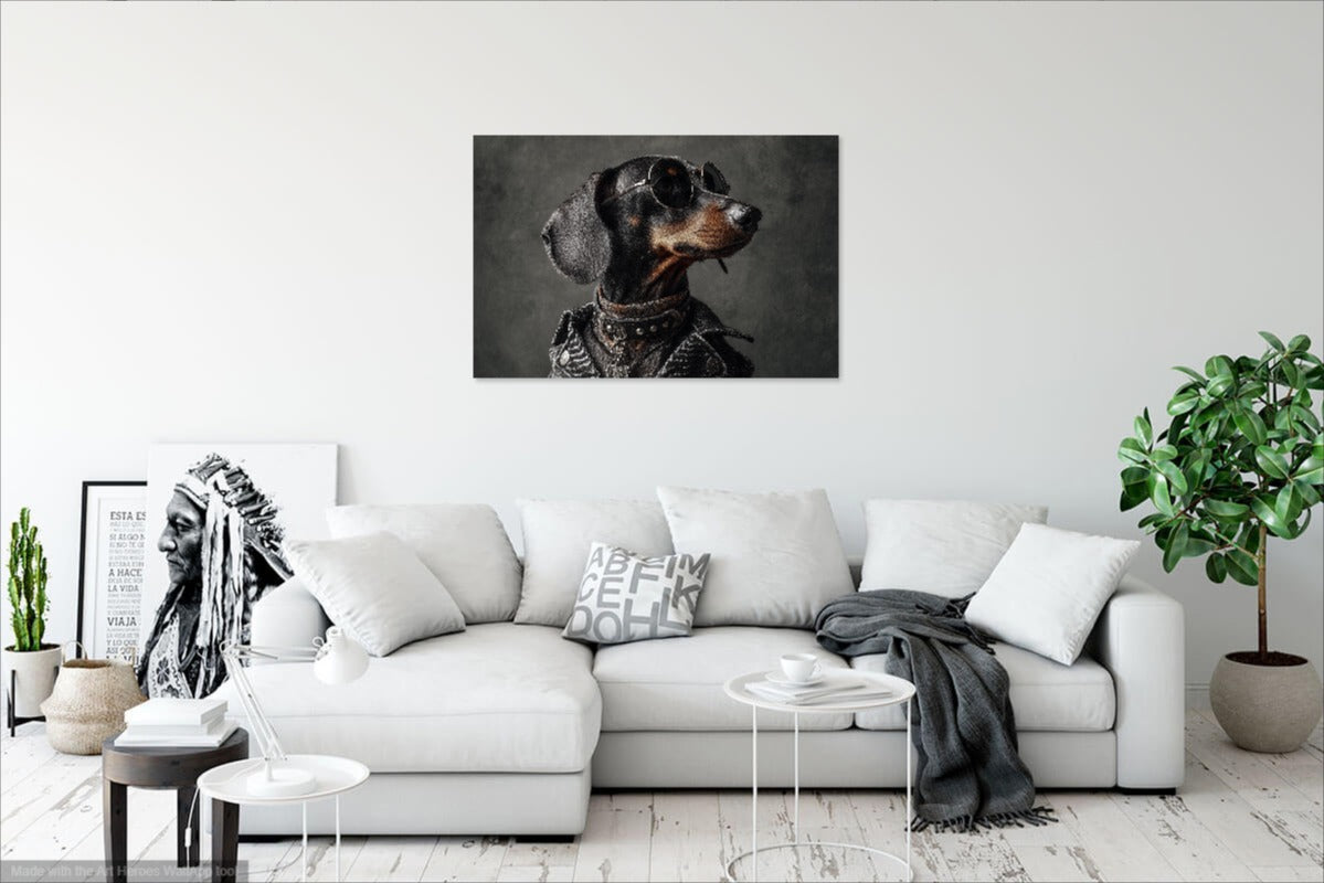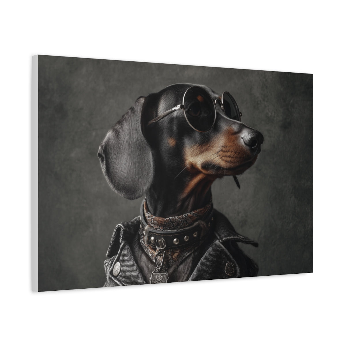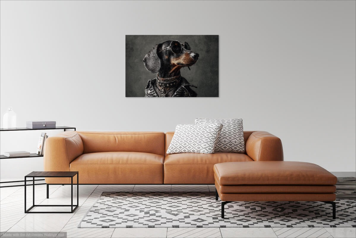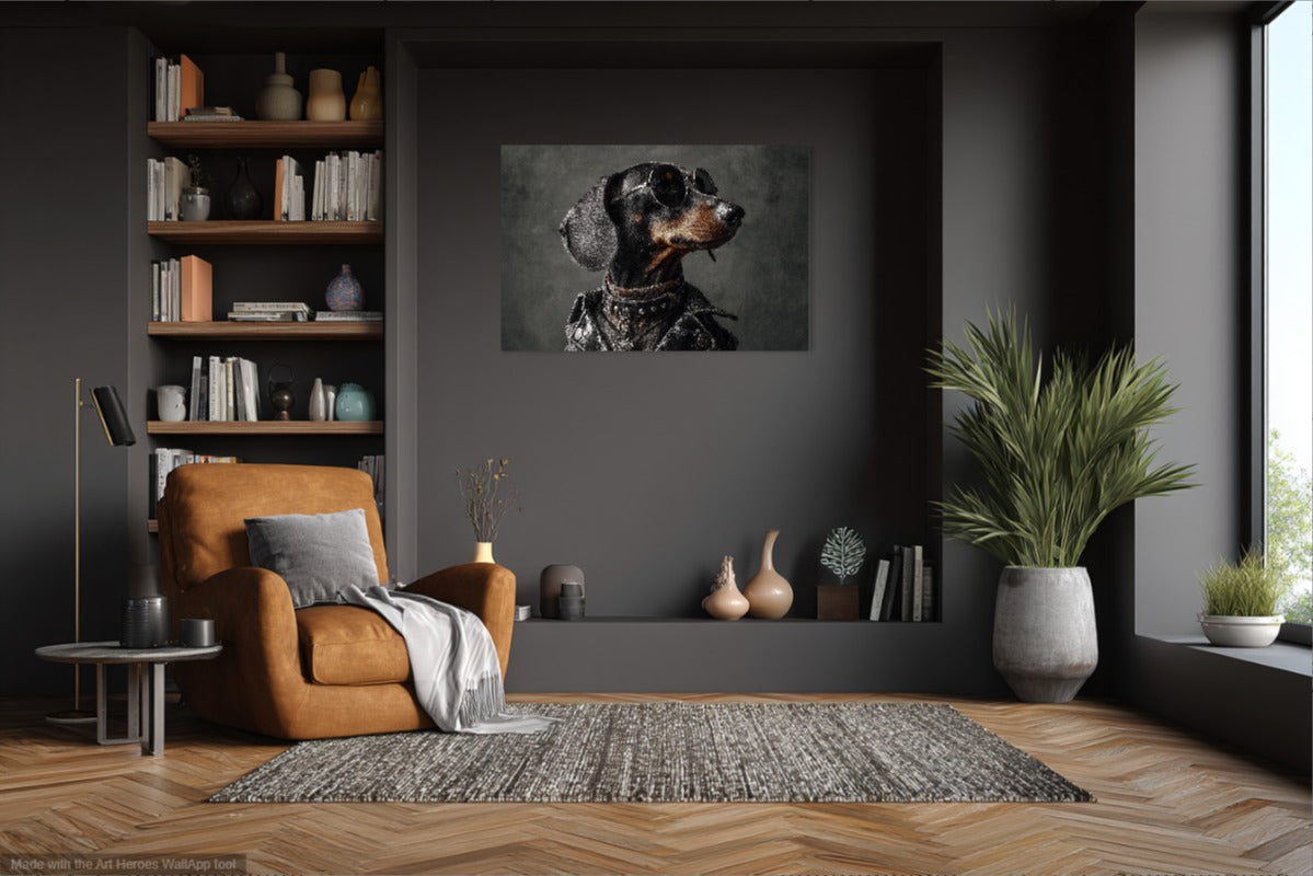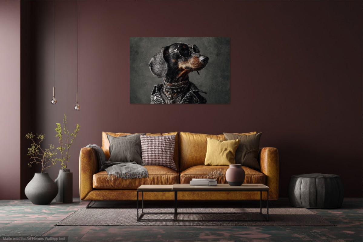 Ten obraz przedstawia wyjątkowego jamnika w stylizacji, która zaskakuje i zachwyca – skórzana kurtka, modne okulary i wyrazista obroża nadają mu charakteru pewnego siebie rockmana. Utrzymany w hiperrealistycznym stylu z fotograficzną precyzją, obraz emanuje wyrafinowaną elegancją, ale jednocześnie z przymrużeniem oka. Ciemne, stonowane tło w odcieniach szarości dodatkowo podkreśla kontrast między eleganckim outfitem a nonszalancką postawą bohatera.