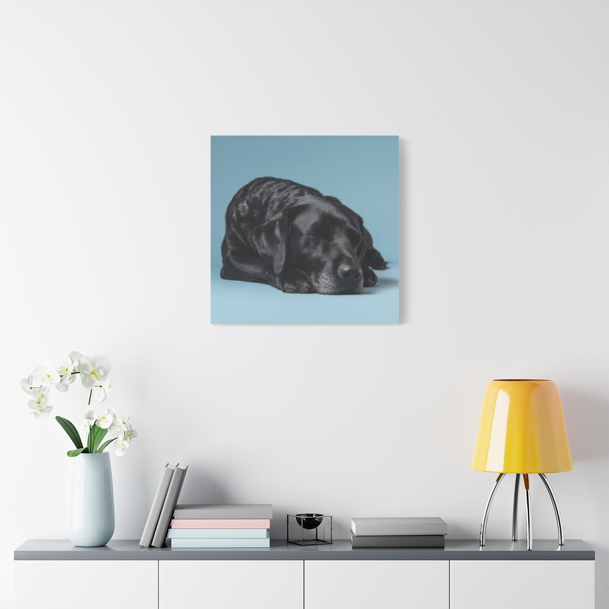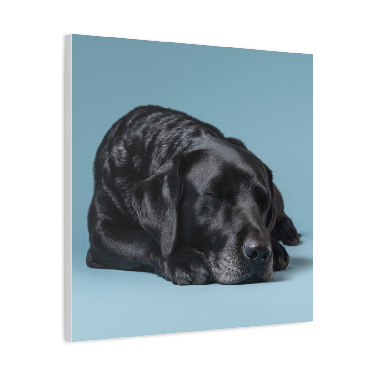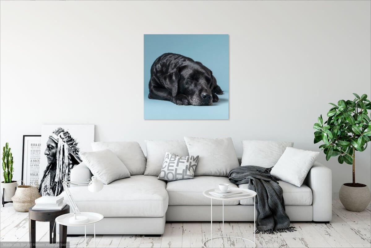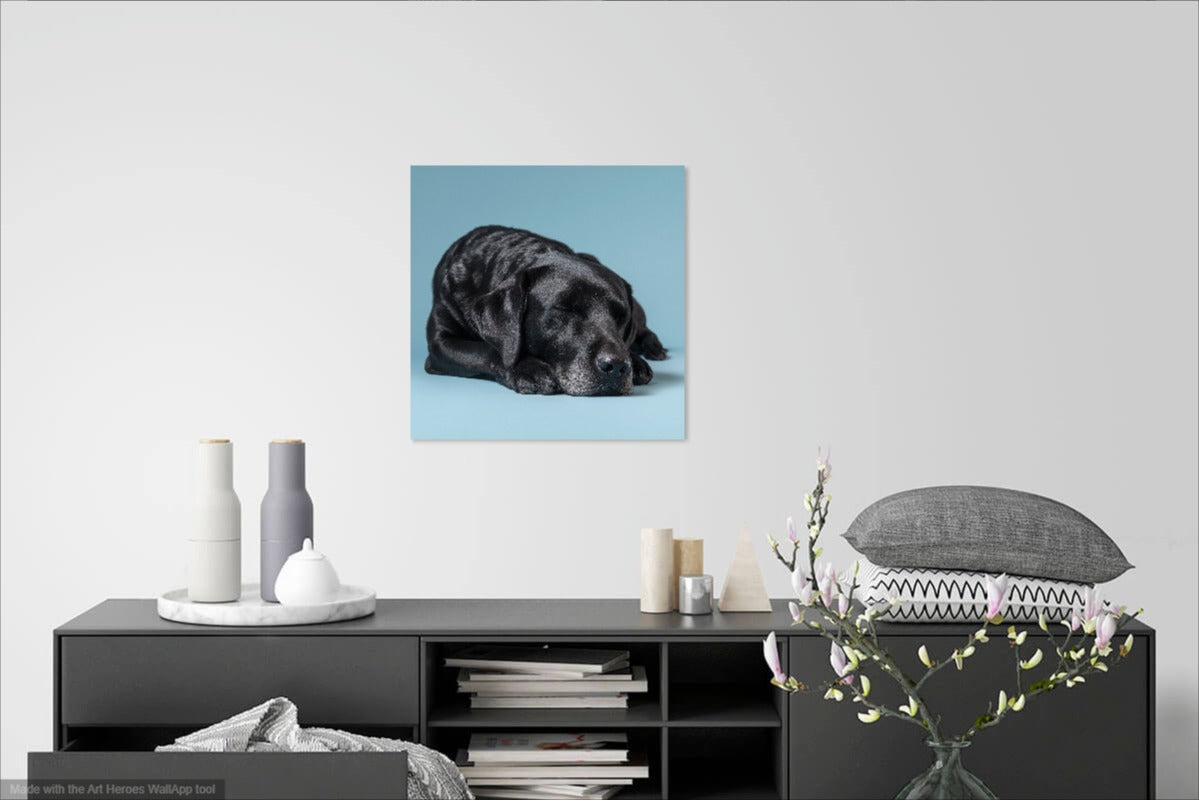 Ten wyjątkowy obraz przedstawia śpiącego czarnego Labradora na tle jasnoniebieskiej, matowej powierzchni. Realistyczna forma i subtelna gra światła podkreślają miękkość futra i spokojną aurę czworonoga. Minimalistyczna kompozycja w nowoczesnym stylu fotograficznym emanuje ciszą, harmonią i ukojenięm.